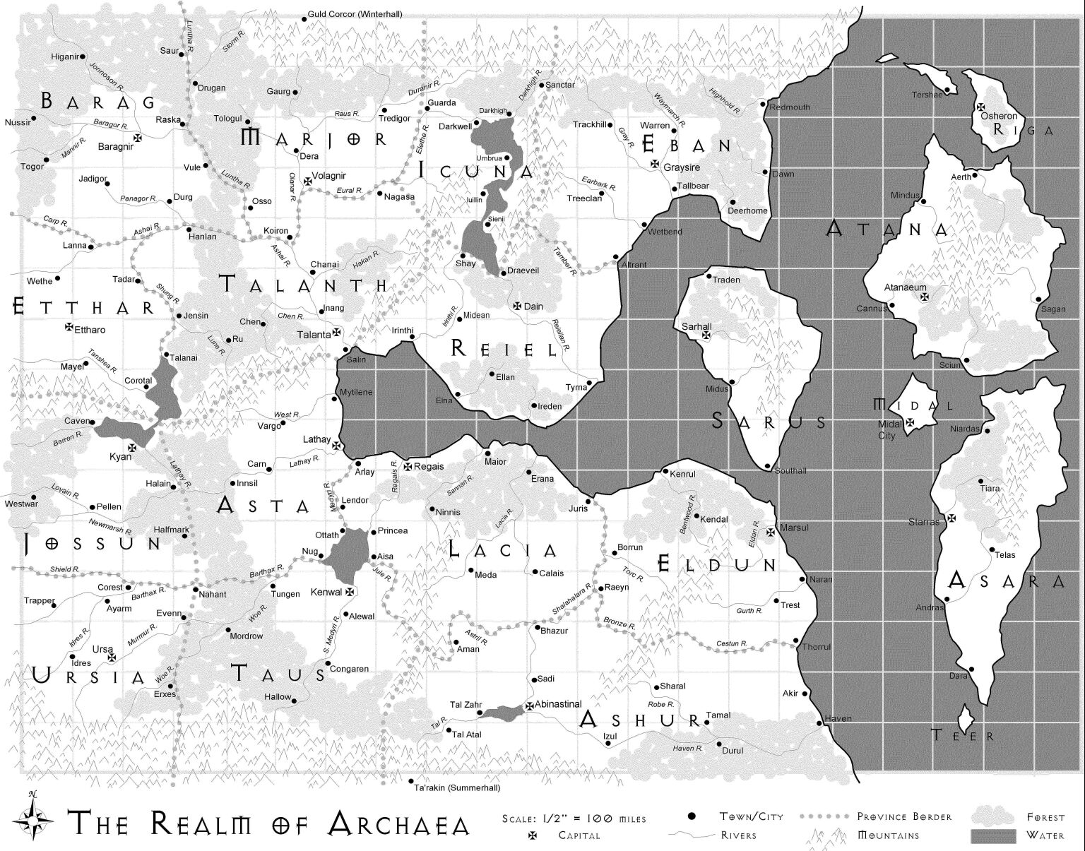Much of Archaea still remains wild and unexplored stretching nearly 2100 miles from east to west and 1500 miles from north to south. The Archaean Sea cuts into the mainland allowing for swift passage from place to place by way of water. The island of Sarus is the seat of the government of the Realm; the Crown resides in the capital city of Sarhall. Politically, the land is divided into individual provinces that swear fealty to the crown of the Sar, the Grand Sovereign of Archaea. For the most part, the provinces retain their own identities and govern themselves. There are twenty provinces. The provinces are divided into three groups: the central provinces, the western provinces, and the island provinces. Furthermore, with the new shifting of the Mists, new lands to the north, called the Winter Wastes, and to the south, called the Southern Wastes, have been revealed.