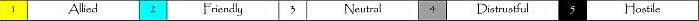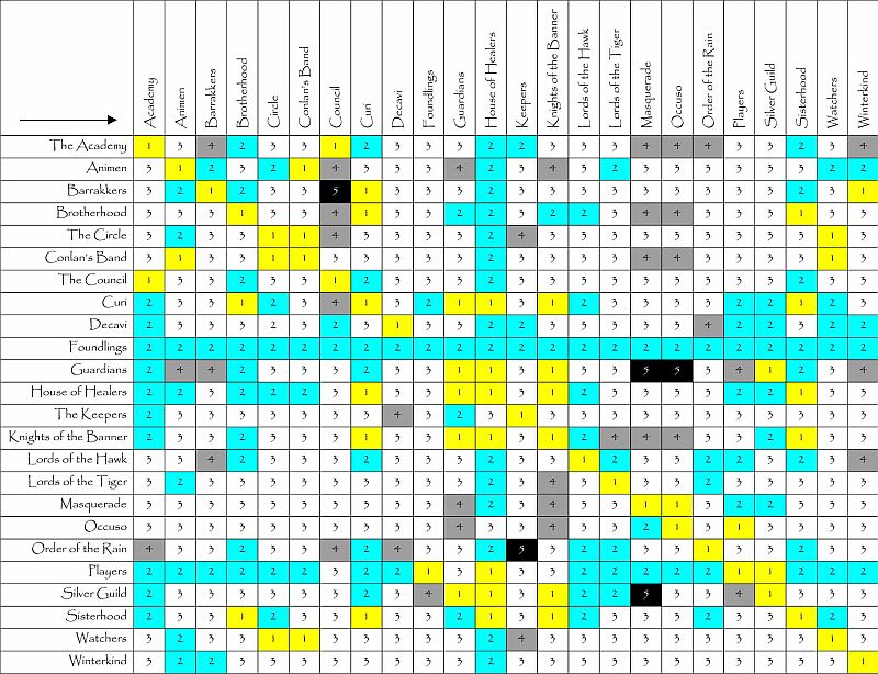 The Organization Alliances Chart below reveals the general standing between the various groups. Reading across from left to right, a numeric value (1 to 5) determines whether the Organizations are allied or "sistered" (1), friendly or cooperative (2), neutral (3), distrustful or opposed (4), or hostile or enemies (5).